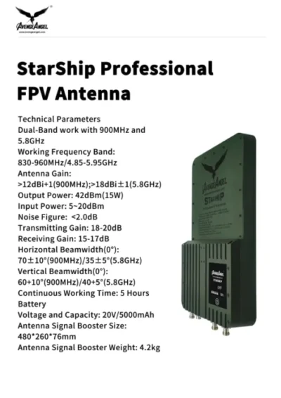 Професійна антена FPV AvengeAngel StarShip, антена FPV підсилювача сигналу, яка застосовується до смуги частот 830-960 МГц і 4,85-5,95 ГГц. Використовуйте подовжувальний кабель довжиною 20 м. Тримайте подалі від джерела сигналу антени.